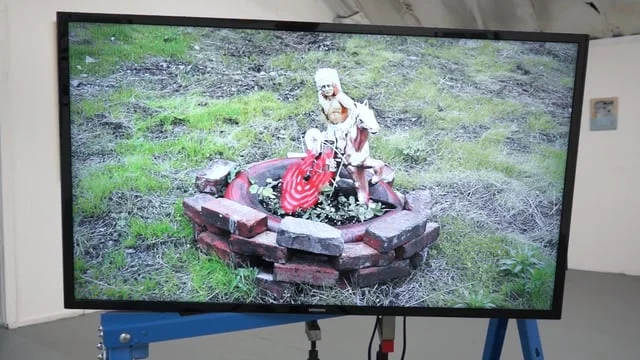 Single Channel Video on Continuous Loop, Monitors, Sawhorse, C-Clamps, Extension Cord, Sand Bags.
